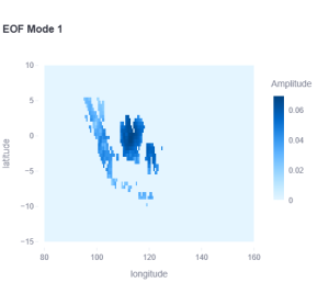Secara klimatologis, pola EOF 1 umumnya mencerminkan pengaruh sistem iklim berskala besar, seperti ENSO (El Niño–Southern Oscillation) atau Indian Ocean Dipole (IOD), yang kuat memengaruhi curah hujan di Indonesia. Wilayah dengan amplitudo tinggi menunjukkan area yang sangat sensitif terhadap perubahan iklim global tersebut, sehingga anomali curah hujan di daerah ini sering dijadikan indikator awal dalam memantau kejadian iklim ekstrem. Dengan demikian, EOF Mode 1 tidak hanya memberikan gambaran distribusi spasial utama curah hujan, tetapi juga menjadi dasar untuk memahami hubungan antara variabilitas global dan respon regional di Indonesia.
