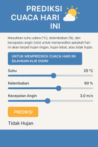 Tiga buah slider input disediakan untuk pengguna memasukkan data suhu, kelembaban, dan kecepatan angin secara manual, dengan nilai rentang yang sudah disesuaikan berdasarkan data historis. Setelah mengisi ketiga parameter tersebut, pengguna cukup menekan tombol Prediksi yang ditampilkan dengan warna mencolok untuk mendapatkan hasil. Hasil prediksi akan ditampilkan langsung di bawah tombol tersebut dalam bentuk teks yang mudah dibaca, memperlihatkan apakah kondisi cuaca hari ini tergolong tidak hujan, hujan ringan, atau hujan lebat. Antarmuka ini mendukung pengambilan keputusan cepat dan cocok digunakan untuk masyarakat umum, petani, maupun pemangku kebijakan lokal.